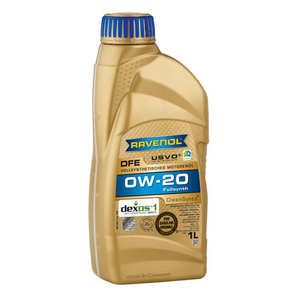 RAVENOL DFE 0W-20 – լիովին սինթետիկ, հեշտ հոսող շարժիչային յուղ, որը հիմնված է PAO-ի (PAO - պոլիալֆաոլեֆինների) վրա՝ օգտագործելով CleanSynto® տեխնոլոգիան բենզինային շարժիչների համար՝ տուրբո լիցքավորմամբ և առանց դրա, օրինակ՝ վառելիքի ուղղակի ներարկման GDI շարժիչների համար: